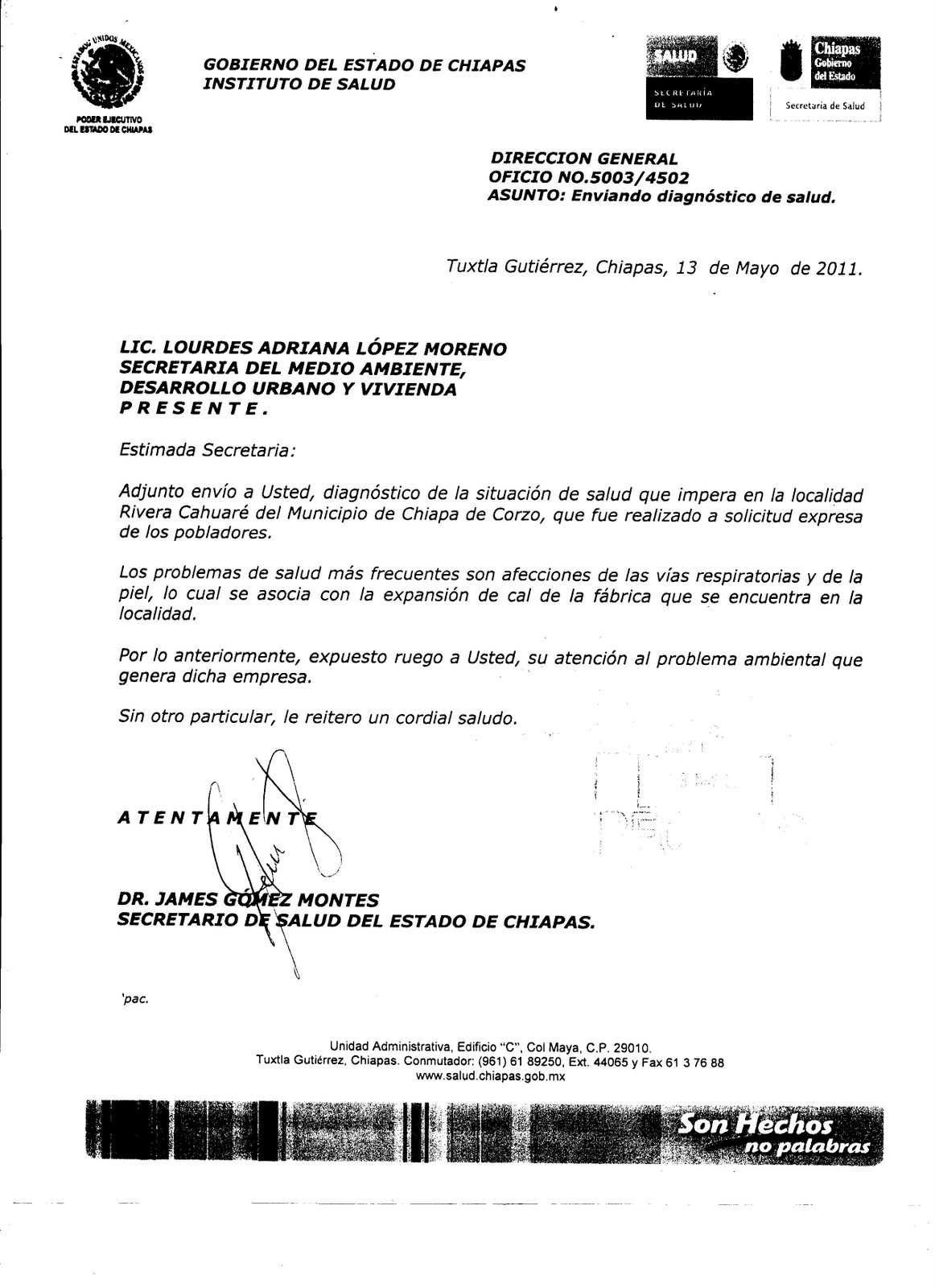 LOS PROBLEMAS DE SALUD MÁS FRECUENTES SON AFECCIONES DE LAS VIAS RESPIRATORIAS Y DE LA PIEL, LO CUAL SE ASOCIA CON LA EXPANCIÓN DE CAL DE LA EMPRESA CALES Y MORTEROS DE CHIAPAS QUE SE ENCUENTRA EN LA LOCALIDAD.